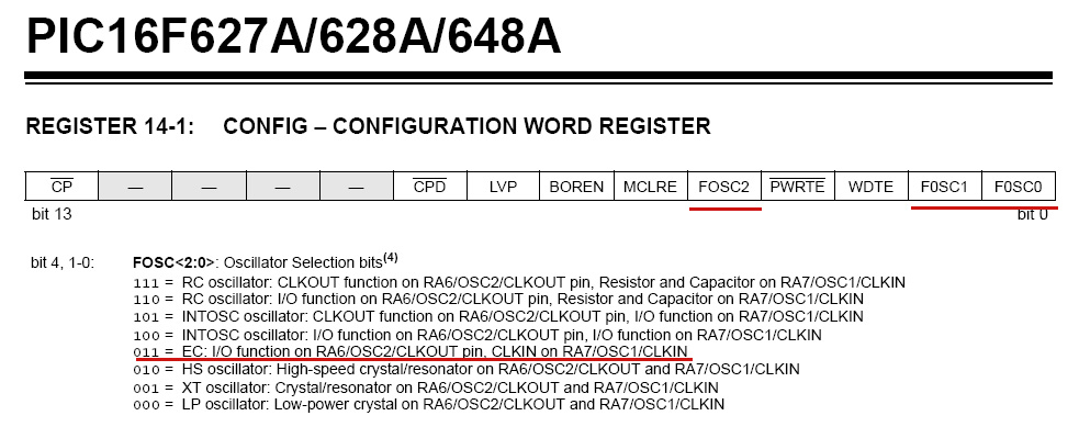 FOSC<2:0>: биты выбора генератора (4) 111 = RC-генератор: функция CLKOUT на выводе RA6/OSC2/CLKOUT, резистор и конденсатор на выводе RA7/OSC1/CLKIN 110 = RC-генератор: функция ввода-вывода на выводе RA6/OSC2/CLKOUT, резистор и конденсатор на выводе RA7/OSC1/CLKIN 101 = Генератор INTOSC: функция CLKOUT на выводе RA6/OSC2/CLKOUT, функция ввода/вывода на выводе RA7/OSC1/CLKIN 100 = Генератор INTOSC: функция ввода/вывода на выводе RA6/OSC2/CLKOUT, функция ввода/вывода на выводе RA7/OSC1/CLKIN 011 = EC: функция ввода-вывода на выводе RA6/OSC2/CLKOUT, CLKIN на выводе RA7/OSC1/CLKIN 010 = Генератор HS: Высокоскоростной кварцевый резонатор на RA6/OSC2/CLKOUT и RA7/OSC1/CLKIN 001 = генератор XT: кристалл/резонатор на RA6/OSC2/CLKOUT и RA7/OSC1/CLKIN 000 = генератор LP: маломощный кварц на RA6/OSC2/CLKOUT и RA7/OSC1/CLKIN