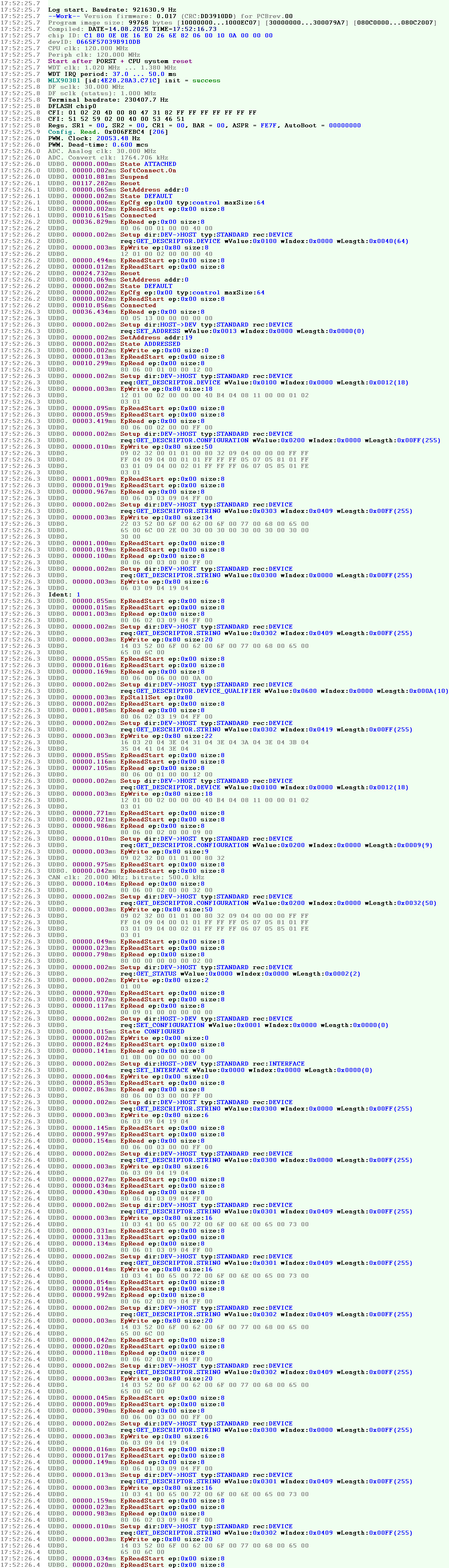 Это чуть лучше, чем отлаживать USB посредством мигающего светодиода. Но зачем так жёстко-то? UART вполне нормально справляется с такой задачей. Вот вывод USB-сниффера моего текущего проекта во время энумерации: СпойлерПоток строк, начинающихся с "UDBG." выплёвывается в UART во время USB-энумерации на 921600 бод. Это расшифровка операций, выполняемых USB-стеком. Конечно это работает с буферизацией в ОЗУ МК. Но работает как видно и без DMA прекрасно. А для современных МК размер ОЗУ-буфера в ~8...16 КБ - как правило не является проблемой. Расшифровка всех USB-кадров выполняется в МК. И весь обмен виден наглядно. Отлаживаться удобно.