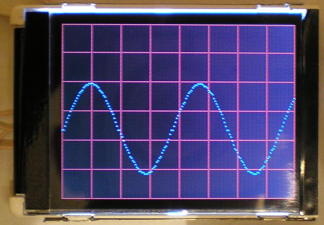 Увидел фото тоже решил попробать на экран вывести каконить сигнал. В этоге имеем L2F50+atmega128+16Mhz на вход АЦП подан табличный синус на R2R делителе.