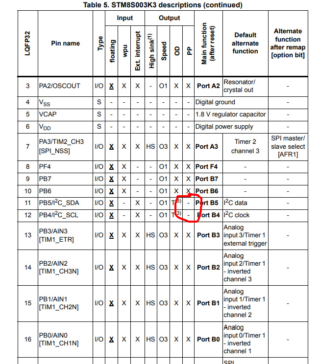 Добрый день. Лет 10 назад купил на алике платку с микроконтроллером STM8S003K3. Почитал про него, ничего не понял и убрал в долгий ящик. Сегодня она мне попалась на глаза, и я решил попробовать разобраться. Написал, точнее переписал найденную программку, успешно помигал светодиодом, вроде все хорошо. Потом решил немного усложнить, подключил светодиодную сборку к порту B, в который вывожу циклически растущую переменную и светодиоды должны показывать инкремент. И вроде бы работает, но возникла проблема - PB4 и PB5 не горят. Пробовал экспериментировать с PB_CR1 и PB_CR2 - ничего не дает. Электрически все хорошо. На этих выводах у него I2C, возможно что-то еще надо настроить? Может есть фьюзы какие-то? Спойлер