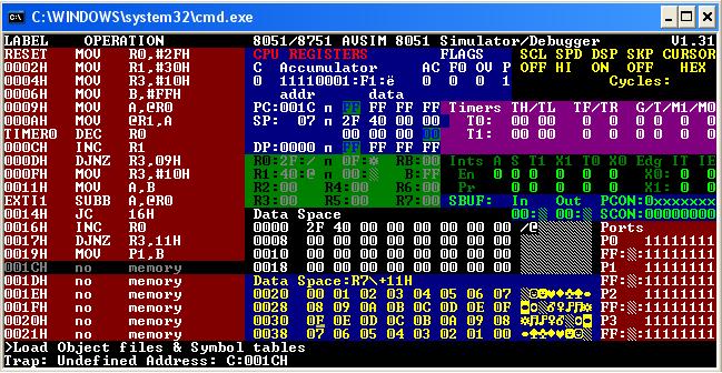 Компилятор ругается вот так: 1 ;начало программы 2 0000 758310 MOV DPH,#10H ; 3 0003 758200 MOV DPL,#00H ; Error in 4: Undefined label: ECH MOV A,#ECH ;первый байт кода в аккумуляторе ^ 4 0006 7400 MOV A,#ECH ;первый байт кода в аккумуляторе 5 0008 F0 MOVX @DPTR,A ;первый байт кода в памяти программы 6 0009 7478 MOV A,#78H ;второй байт кода в аккумуляторе 7 000B A3 INC DPTR ;наращивание указателя памяти 8 000C F0 MOVX @DPTR,A ;второй байт кода в памяти 9 000D END
