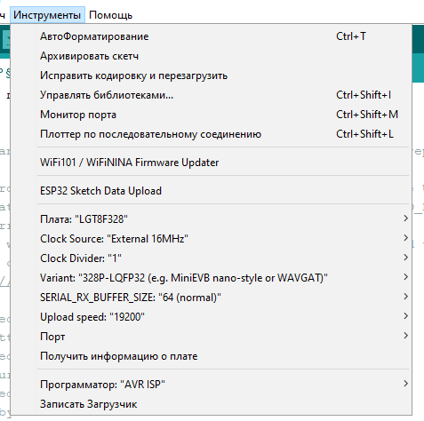 В этом случае я бы получил не программатор, а плату ардуино нано с кодом BLINK внутри. Только опять мимо! Программатор исправно транслирует код в LGT8! Просто он априори не может себя перепрошить. В ATmega8, в программаторе, зашит свой загрузчик, а в менеджере плат ИДЕ выбрана плата LGT8! И загрузчик у нее свой.
