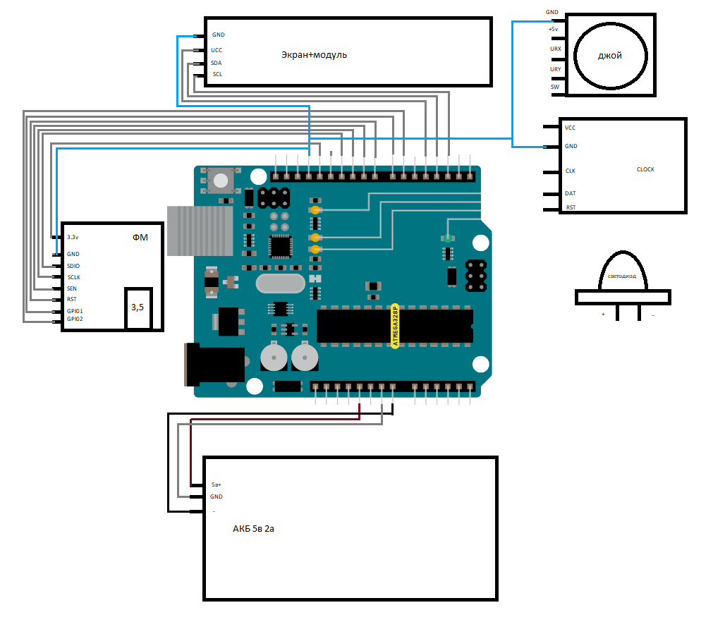 Кстати о питании, вроде как выходит что всё у меня 5в, за исключением ФМ, так как он судя по всему 3.3в