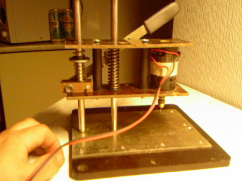 На этой фото на заднем плане виден предыдущий девайс, на двигателе ДПМ прикрепленном консольно к фланцу прессика... Станина от бинокурярного микроскопа, консоль движется по "ласточкиному хвосту". Двигатель ДСР-22, 27 вольт, вроде около 4700 оборотов. Внутри станины установлен транс, выдающий после выпрямителя 30 В, затем схема Савова для регулировки оборотов в зависимости от нагрузки на двигатлель из статьи "Ковырялочка для пп". с отдельной обмотки транса снимается 6 вольт для подсветки. Для сверления металла 4700 оборотов это очень много, достаточно пары сотен, так что планирую прикрутить еще и жесткую регулировку оборотов двигателя.