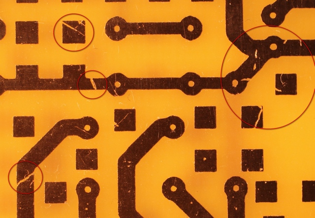 И еще. При детальном изучении под микроскопом были обнаружены дефекты на проводниках в виде тонких (около 0,1 мм) протравленных линий и точек. На плате 70х70 мм обнаружил 3 линии полностью перерезавшие 1 мм проводники. Точек будет около полутора десятка, но они не мешают, хотя и не приятно. Как вы думаете, что может вызвать такие дефекты. На производителя кивать не хочется, что-то у меня, но что? Да, когда снял защитную пленку поверхность резиста у меня никаких подозрений не вызвала.
