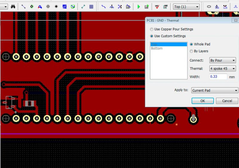 timer32 Там два полигона. Один без термобарьеров, другой (который расположен за границами платы) с термобарьерами. Нужно удалить (совсем) тот, который за пределами и настроить оставшийся.