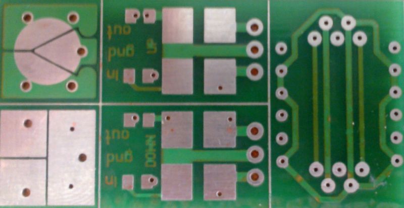 uk8amk По отверстиям видно что вы плату слабо качали, либо не качали совсем. Ультразвук тут не поможет, надо во время процесса гальваники плату просто постоянно качать, для доступа свежего электролита к отверстиям. Графит в принципе не плохая технология, но адгезия и трудозатраты с ним не очень как то. Попробуйте гипофосфит, очень технологично. Нужна только печка, ну и небольшое количество довольно доступных, и самое главное не токсичных реактивов. Аммиак разве что воняет. conler Примеры для того и выкладываю. Что бы форумчане видели, хорошие платы можно сделать и на коленке. Но что то активные участники темы пропали. Лето видимо, один я получается платки ваяю Вот кстати вчера сделал. Мульти плата так сказать. Перегрел маску, медь под ней потемнела.