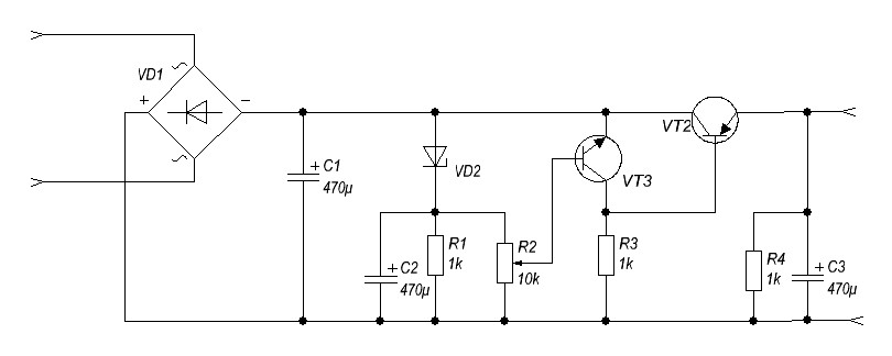 на r3 относительное фиксированное напряжение со стабилитрона 13в, значит r3 может менять напряжение на базе vt2 от 1 до 13в. при этом напряжение на эмиттере vt2 синхронно меняется от 0.6 до 12.6в.
