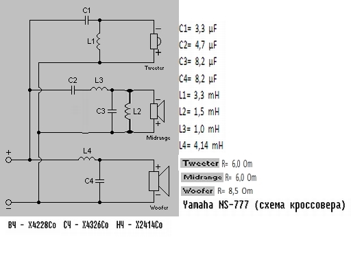 Уважаемые спецы форума !!! У меня акустика Yamaha NS-777 кроссовер собран на неполярных электролитах катушки индуктивности на ферритах, решил заменить конденсаторы на К73-17 катушки поставить на воздухе ! Нарисовал схему (потому, что в интернете не нашёл) переписал номиналы конденсаторов индуктивности измерил (меня смущает полярность подключения твитера ?). На динамиках указано только вот это ВЧ - Х4228Со, СЧ - Х4326Со, НЧ - Х2414Со (характеристик в интернете не нашёл). Скачал программы JBLspeakershop, LspCAD, BassBox 6 Pro (и другие) пытался с теми данными , что имею (не меняя схему кроссовера) пересчитать его, ничего не получилось. Что посоветуете ? Схему прилагаю. Удачи !!!