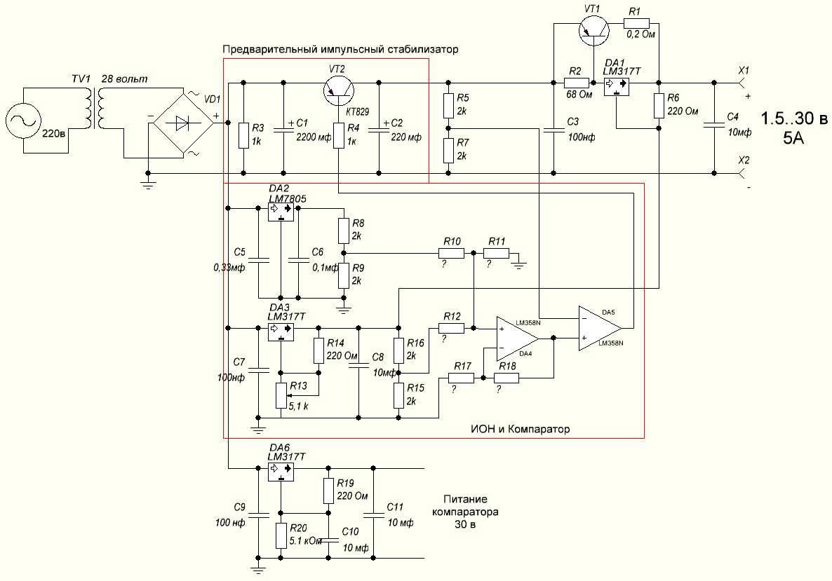 Здравствуйте коты. Посмотрите пожалуйста, жизнеспособна ли разработанная мной схема? (точнее схемотехника, многие узлы не просчитаны, номиналы выбраны предварительно) Краткая идея: Использовать стандартный LM317T умощненный транзистором. Чтобы уменьшить ее разогрев, поддерживаем напряжение на ее входе всегда выше на 5в, при помощи предварительного импульсного источника питания. ИОН задает напряжение на выходной LM317T. С этого же ИОН берется опорное напряжение, которое суммируется с ИОН на 5 вольт и подается на компаратор, поддерживающий напряжение предварительного импульсного источника. Ожидаемые параметры лабораторного БП: 1.5-37в 5а. Далее планируется доработка. Добавление еще одного компаратора, ограничивающего выходной ток.