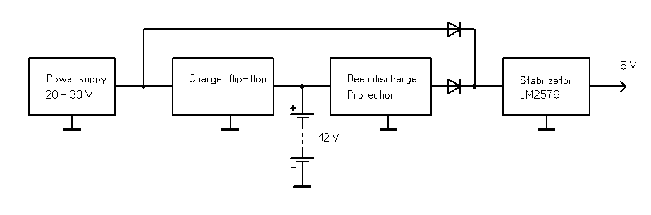 Пока есть питание с БП (из сети) качели поддерживают напряжение на аккумуляторе и держат его в оптимальном режиме, весь ток минуя качели идет на Стабилизатор напряжения в 5В и питает какое-нибудь устройство (что и есть нагрузка). Если же Свет выключили, то питание Стаба на 5В происходит с аккумуляторной батареи.