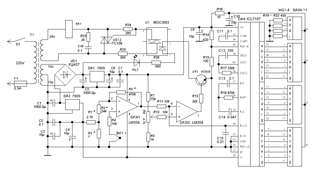 Принцип работы. Под спойлером много букв. СпойлерПредполагаемый принцип работы: через сопротивление, на базу транзистора Т3, со средней точки, поступает отрицательное напряжение, открывающее транзистор. Через Т3 на базы транзисторов Т4, Т5, Т6 поступает положительное напряжение открывающее их. Т4, Т5, Т6 коммутируют регулирующие цепочки, нарисованные на схеме черным цветом. Схема работает в штатном режиме. При замыкании геркона, на базу Т1 поступает напряжение открывающее его. Через Т1 положительное напряжение поступает на Т2, который коммутирует цепь "обороты ждущего режима" и на Т3, который закрывается, соответственно транзисторы Т4, Т5, Т6 тоже закрываются. Также положительное напряжение через Т1 поступает на Т7, Т8, которые коммутируют цепь "Температура фена ждущего режима". Это же напряжение запускает таймер на NE555, который начинает отсчитывать 30 секунд, после чего, через Т12 отрицательное напряжение поступает на базы Т10 и Т11, закрывающее их. Т10 отключает эл. двигатель, а Т11 прекращает подачу напряжения на ключ VT1, соответственно ... в общем нагреватель фена отключается. При размыкании геркона схема переходит работать в штатный режим. Есть у меня сомнения, на счет работы коммутации в стабилизаторе питания эл двигателя. Т1, Т3 и Т10 питаются от DA1, а у DA4 нет соединения с общей точкой трансформатора. Остальное, вроде, должно работать. Есть у кого какие мысли на счет этой схемы?