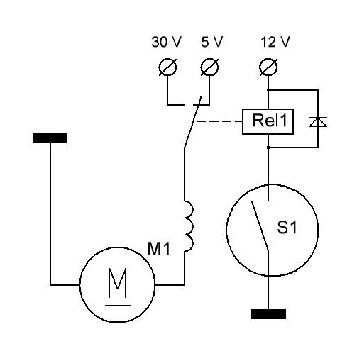 При подаче напряжения работает двигатель от 5 вольт. Если остановить движок рукой, возрастает ток до 260 mA в катушке индуктивности, нарастает магнитное поле, которое замыкает геркон; геркон в свою очередь задействует реле, которое переключает двигатель на 30 вольт. При отпускании двигателя движок переключается на 5 вольт.