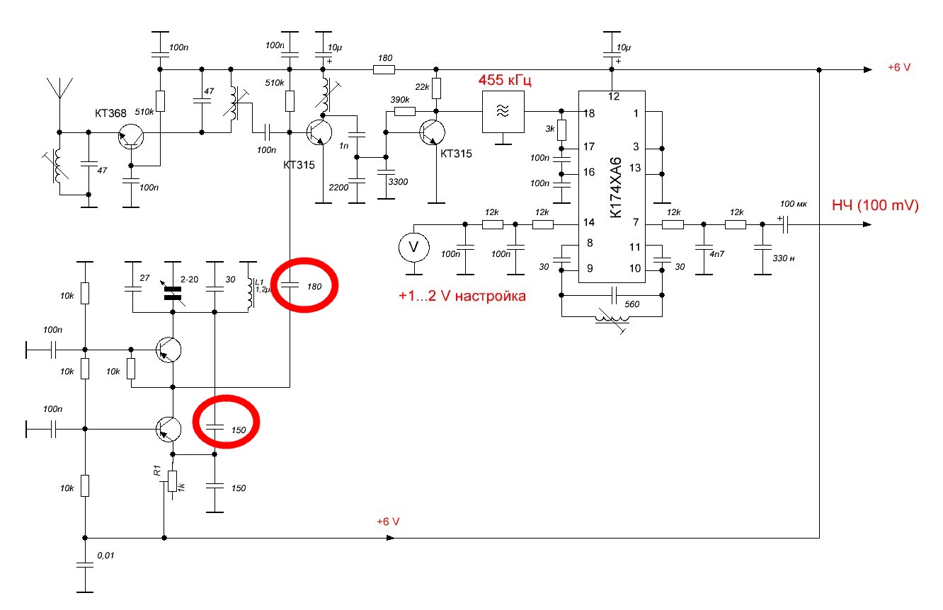 1) ок. 2) по невнимательности написал не тот номинал. Схему прилагаю. Кондёр связи ГПД-смеситель брал разные от 5,6 пф до 180, толку нет: ДО кондёра ВЧ есть, ПОСЛЕ - нет.... 3) на генератор не настраивается. Вещалки ловит через раз... Короче, какая-то мистика с этим приёмником)))
