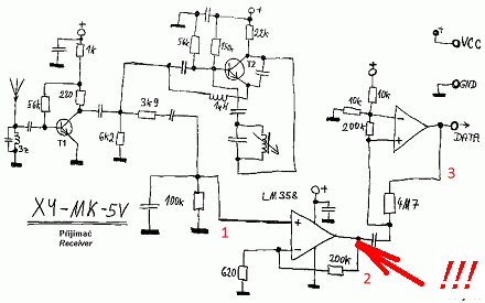 А мне вот уже давно хочется придумать приемник, что бы по сложности, в том числе и настройки он мало отличался от сверхрегенератора, а по параметрам был намного лучше, поэтому, если не трудно, то не смогли бы Вы сделать осциллограмму в точке "2" и в точке "3" с антеннами на передатчике и приемнике длиной по 5 см? Расстояние между передатчиком и приемником должно быть 5 метров. Это мне так квартира позволяет разносить, что удобно.