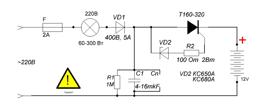 та хоспади...там три элемента всего да сетевая вилка с 1,5м провода....если на постоянку(много АКК восстанавливать)-то еще пара "крокодилов"....думаю,не стоит объяснять...контакт с клеммами АКК-очень важен...при обрыве/отвале "минуса" на АКК оказывается фаза....думаю,чем это чревато при "цапании" руками-объяснять вам не стоит. при надежном контакте и исправном АКК...а так-же сборке именно как нарисовано - безопасность полная...мультиметром можно контролировать напряжение на клеммах-не отключая АКК от сети.