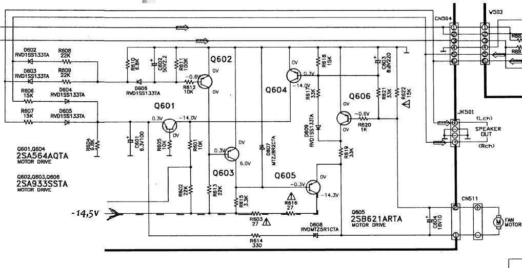 Подтянул 3/503 "DCDET" резистором к 8 вольтам через 10к, отсоединил линию выхода, где "уши", подал на выходные клеммы УЗЧ 9 вольт, а потом 18, от батареек Крона... Вентилятор включается, а на линии 3/503 "DCDET" ничего не меняется. Хотя по идее должен открываться Q568 и тянуть линию к общему проводу...