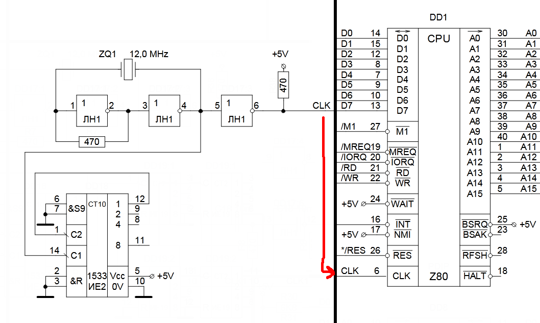 ммм ну вот схема не обрезанная, если нужно. Это типичная схема включения кварца в отечественных клонах Спектрума, например. Собственно, работать и будет в некоем гибриде на Z80. Сигнал CLK идет сразу на процессор, его инверсная копия - на счетчик-делитель. Целиком схему, полагаю, постить смысла нет - все, что касается кварца, изображено тут. ЛН1 - 1533ЛН1