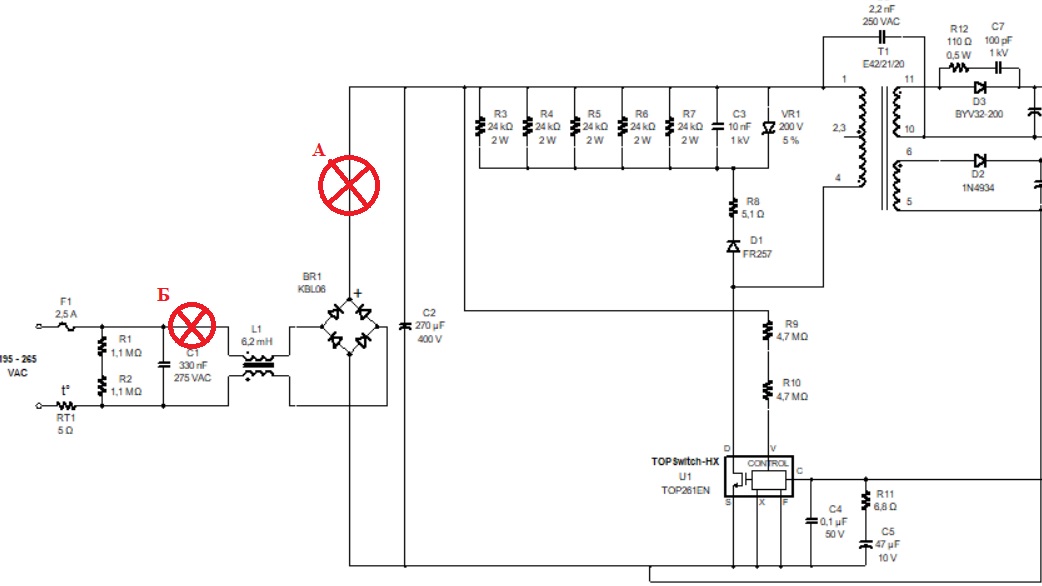 Всем привет! Включаю в разрыв лампу 40 Вт на 220 В перед БП. Лампа мигает, а в блоке клацает слегка, как будто микросхема включается и отключается. Не может блок стартануть, ему что то мешает и чип отключает работу. Но это уже лучший результат от предыдущего. Здесь уже видно, что блок хочет запуститься, тогда этого не было. Нагрузкой служит 4 резистора по 4,7 Ом по 2 Вт, соединенных последовательно. На выходе есть вольтметр, но он молчит. Отключил от сети, померил напряжение на конденсаторе, отсутствует, ушло уже. А на обратке на конденсаторе присутствует 15 вольт и уже прошло около 5 минут. Может вы подскажете?