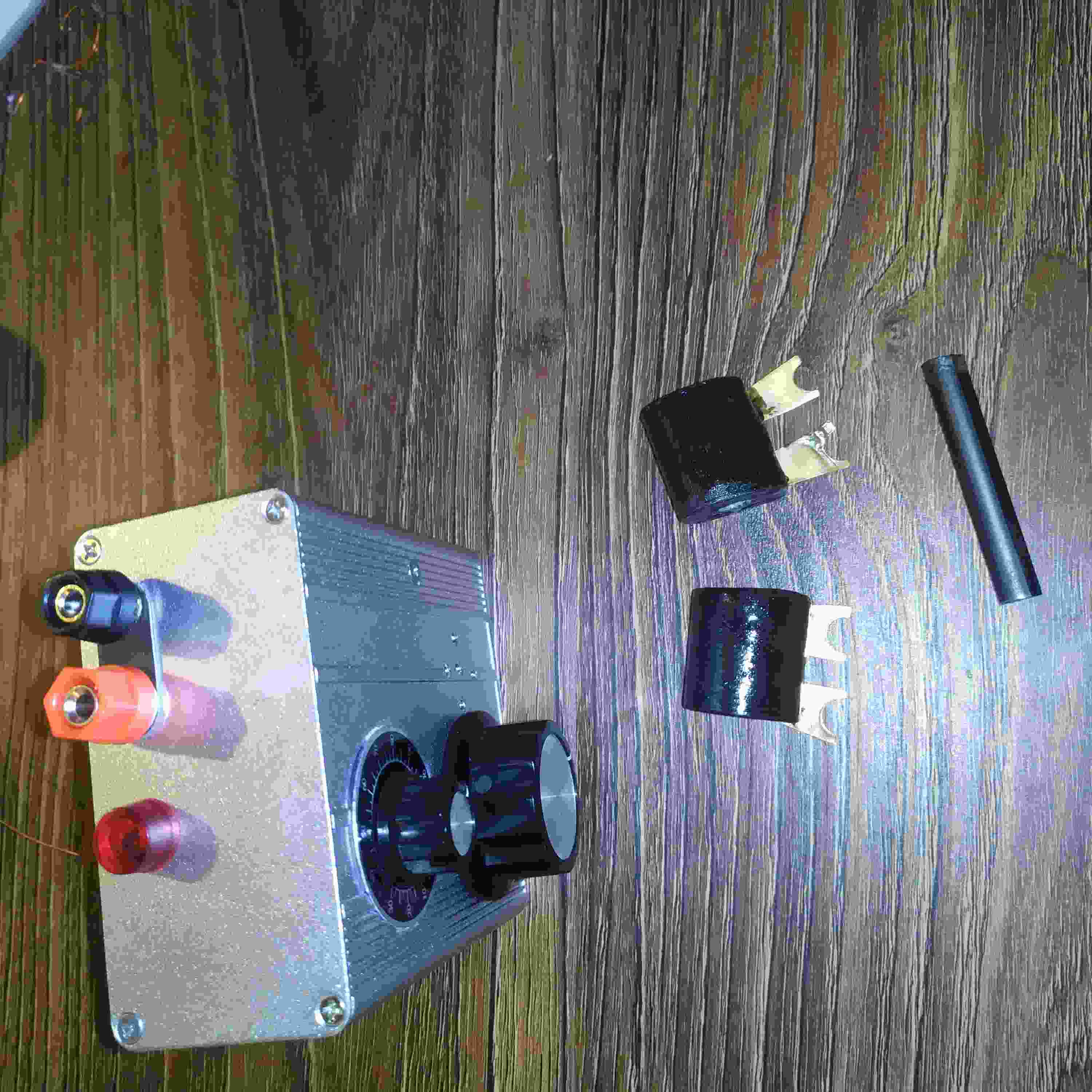 Полностью разбирать не стал, под нижней крышкой батарейки, переменник регенерации и доступ к плате приемника, динамик там же висит на жестком креплении из жестяной банки. под верхней крышкой видно переменный конденсатор, собранный из склеяных кусков сайдинга (отлично подходит для таких изделий, на суперклей все делал), ротор и статор бабочкой из платы, медную сторону резаком по контуру выскабливал, в качестве изолятора меж ними использовал кусок от папки для документов, она тонкая и не протрется. Верньер: шкивок из сайдинга (он же ротор непосредственно), ось ручки верньера замудрил из листового металла и болта с гайками и шайбами, без подшипника, просто в отверстия подогнано, люфтик небольшой, не раздражает, на частоту не влияет, копроновая нить с пружинкой. усилитель с китая валялся на 18вт. возился больше всего с кпе