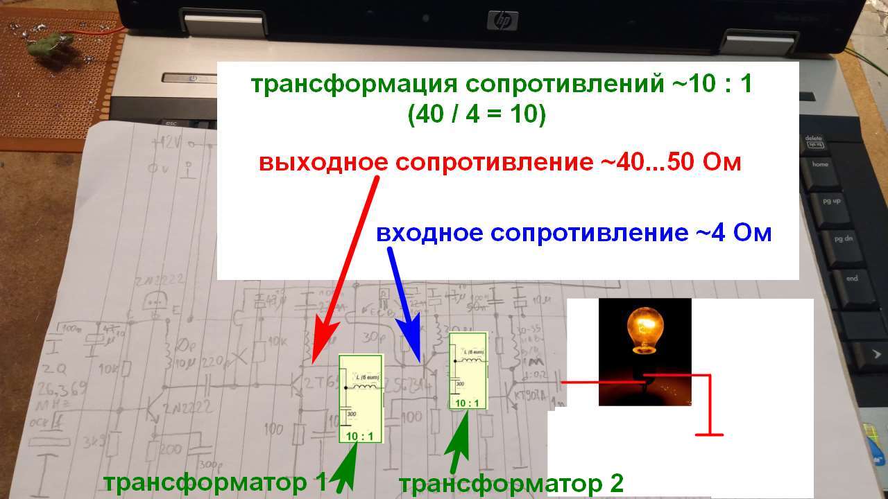 выходное сопротивление транзистора примерно 50 Ом. входное сопротивление транзистора примерно 4 Ом. чтобы согласовать выходное и входное сопротивление транзисторов нам нужен понижающий трансформатор в 10 раз. (коэффициент трансформации 10:1).