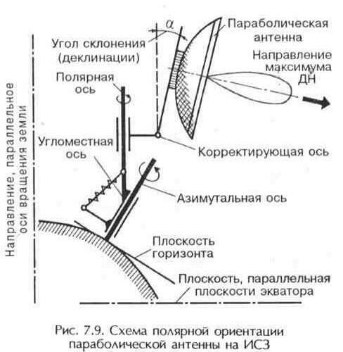 Все геостационарные спутники находятся на одной линии, которая представляет собой окружность. Поэтому есть возможность вести ориентацию антенны только по одной кривой с помощью одного поворотного устройства. Для этого антенна должна вращаться по азимуту не вокруг вертикальной азимутальной оси, а вокруг дополнительной оси, параллельной оси вращения Земли, которая соединяет северный и южный географические полюсы. В связи с тем что в направлении оси вращения Земли находится Полярная звезда, эта дополнительная ось называется полярной осью.