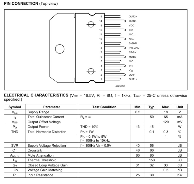 Добрый вечер. Плата от телека LG, МС-022А. Пощипана, но БП в порядке. На микросхему TDA7297 поступает питание 15.7в, на ноги 3 и 13. На ноге 7, ST-BY 2.46в, на ноге 6, MUTE, напряжения нет. На ноги 4 и 12, перед кондерами 0.22мФ, подавал сигнал, один канал поочереди, на выходы динамиков цеплял динамик 8 Ом. Не работает, на полной громкости сигнала, в динамике чуть шуршит. Этот же сигнал на другой усь, всё Ок. Подскажите пожалуйста, что можно сделать, чтоб запустить усилок.