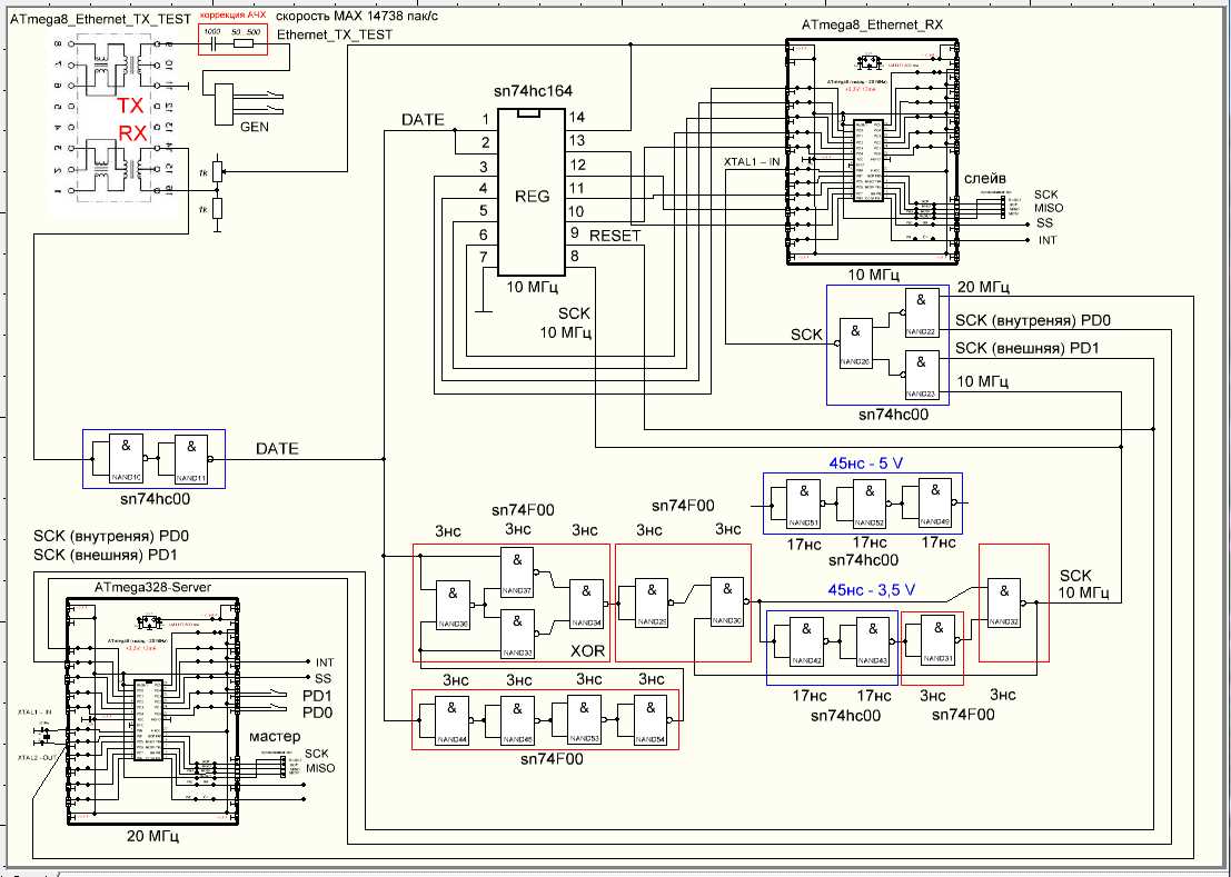 Добавлено after 59 minutes 49 seconds: Дописал время распространения сигнала по логическому элементу (установил 15нс), XOR сделал на транзисторах, вписал приём в 4 корпуса... но по времени получилось впритирочку... как у тебя такие длинные цепи успевают Спойлер