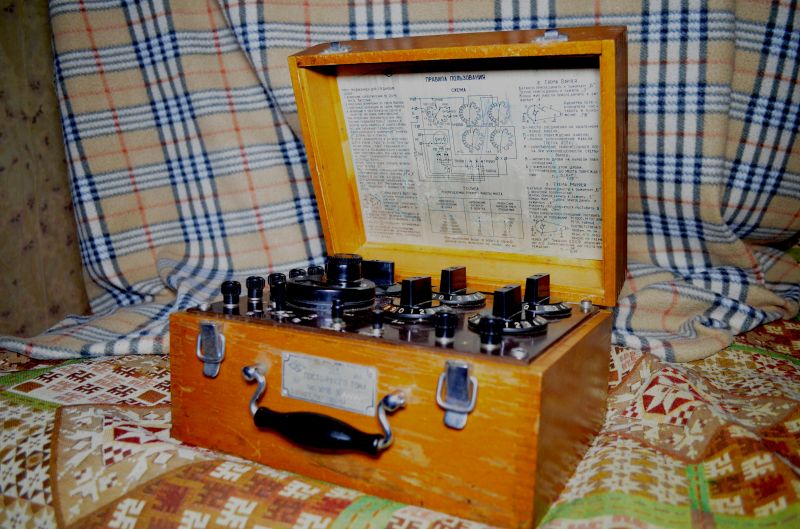 Многочисленные шрамы на корпусе неиллюзорно намекают, что этот экземпляр за свою первую жизнь повидал много всякого... Его вторая жизнь началась после попадания в неприятность (точнее, под гусеницу танка в Югославии). На стрелочной головке ни царапины, но вот корпус самого мультиметра, бутерброд гетинаксовых плат внутри него и карболитовый корпус магнитного расцепителя - всё это превратилось в разноцветный винегрет. После такого кто-угодно впал бы в уныние. Но только не инженер советской закалки. Топология двусторонних гетинаксовых плат была аккуратно скопирована и на её основе вручную изготовлен новый комплект плат из фольгированного стеклотекстолита. Корпуса и установочные элементы склеены. Все уцелевшие детали перенесены на новые платы, а повреждённая пара резисторов заменена на отечественные (именно в таком виде прибор достался мне по наследству).