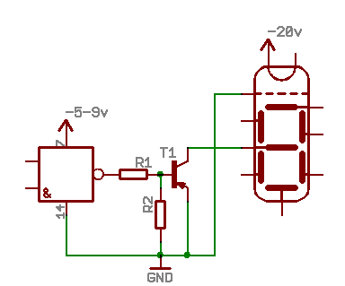 Работает следующим образом. При лог.0 на выходе микросхемы, транзистор Т2 заперт и на схему не влияет. Анодный ток лампы свободно течет через резистор R1. При лог.1 на выходе микросхемы, транзистор Т2 открывается и шунтирует лампу. Так как напряжение коллектор-эммитер в насыщенном транзисторе очень низкое, меньше вольта - напряжение на аноде падает и сегмент перестает светиться. Резистор R1 надо выбирать, таким, чтобы при закрытом транзисторе через лампу шел достаточный анодный ток (поэтому чем меньше, тем лучше), но при открытом транзисторе не превышал максимально допустимый ток коллектора. Лучше конечно до этого максимума всё же не доходить. А то так и вижу - берем транзистор с макс.коллекторным током 10А, при питании 20 вольт резистор выбираем 2 Ом . Типовые значения от 15кОм и выше. При 15-ти вольтовом питании и R1 15кОм ток КЗ составит 1 мА, значит анодный однозначно будет меньше 1 мА - маловато, но светить уже должно. Недостаток этой схемы в том, что большая часть энергии источника питания уходит на нагрев этого резистора R1 (Причем в схеме их, как правило, несколько - даже для одной лампы их будет 7-8 штук на каждый анод сегмента).