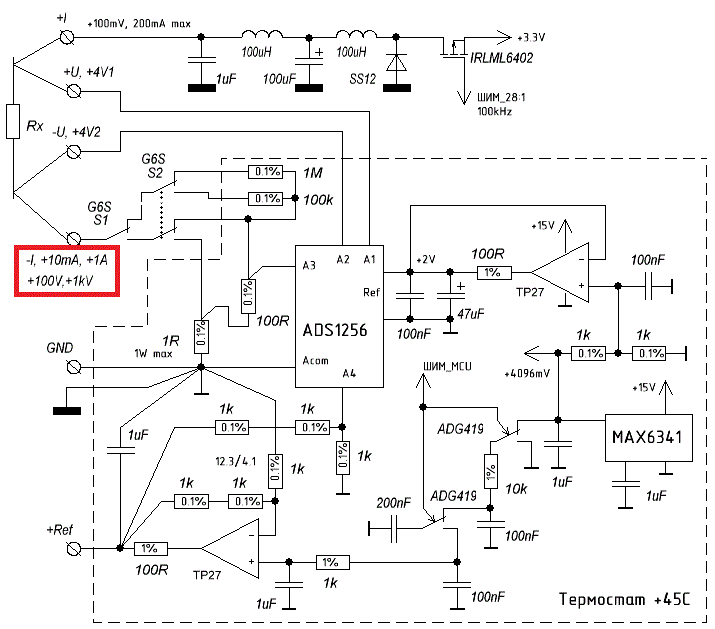 Николай_С, для измерения высокого напряжения используется делитель, сигнал на верхний резистор (1МОм или 100кОм) поступает через реле, а функцию нижнего резистора делителя выполняет сопротивление токового шунта 10мА (100R+1R). Получается понижение напряжения примерно в 1000 или 10000 раз. Или вы тролите?