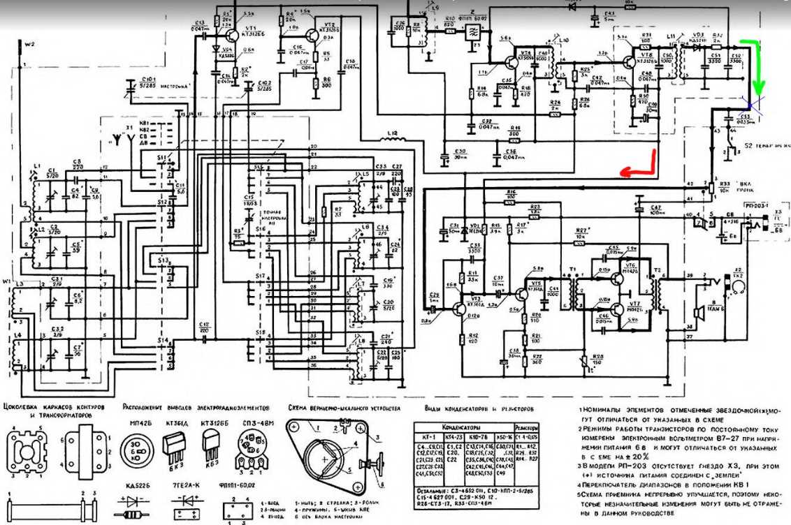 Помогите, пжл. разобраться со схемой радиоприёмника "Россия РП-203-1". Есть у меня такой, новый, лежит без дела. Хочу вставить в него блютус модуль, и получить в итоге винтажную блютус колонку. За качество схемы извиняюсь, это всё, что я нашёл в сети. Зелёной стрелочкой на схеме я обозначил начало УНЧ тракта, а синим крестиком, то место, в обрыв которого, хочу включить выход блютус модуля, с сохранением функционала родного регулятора громкости и регулятора тембра. А красной стрелочкой обозначил то, чего не понимаю. Зачем нужен этот выход из ВЧ части, куда-то в середину УНЧ? Будет ли логичным отключать от УНЧ эту дорожку в районе красной стрелочки, вместе с отключением синего крестика? Вот ссылка на схему https://cloud.mail.ru/public/abYt/aNYix14sM Теги "[img]...[/img]" не срабатывают.