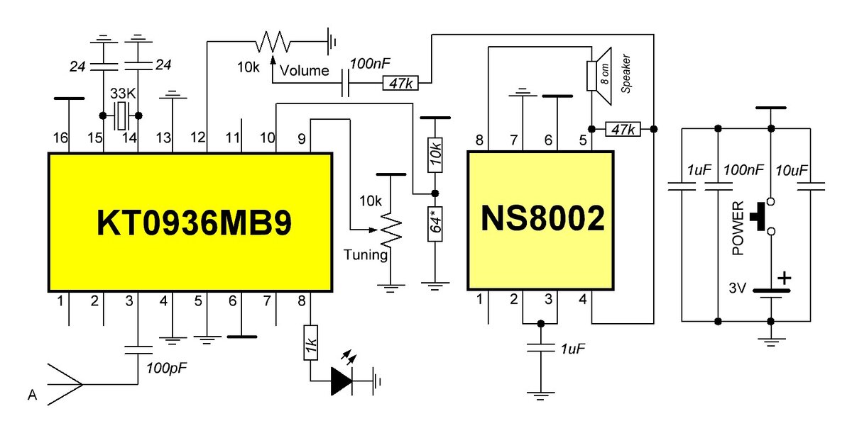 Китайская микросхема "Радио всё в одном" KT0936M и более новая KT0936M B9 Диапазон 500(150)кГц-110МГц. Переключение диапазонов с помощью резистивного делителя напряжения. Настройка переменным резистором. ФМ, АМ. Индуктивности отсутствуют.