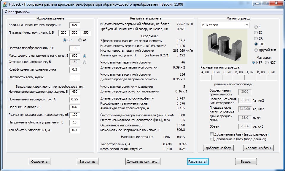 Индуктивность 591(в программе)-610(у меня)подгонял зазором-величина как в программе-примерно 1мм, индуктивность рассеяния не мерял-каюсь. Изоляция-молярный скотч (после первички в один слой)-2слоя, потом по одному. И интересует значение индуктивности первички, большое расхождение м-у PiE и программой Starichok51 ну и зазора конечно, что больше соответствует правильному режиму? Я всё-таки считаю, что снабер, это то-что шунтирует исток сток. Или вот с соседней темы перетянул, там вообще один резистор при бОльших мощностях http://electro-tech.narod.ru/schematics ... atx230.gif