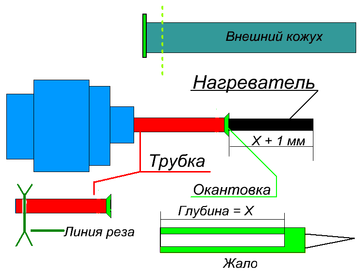 а) Замерять глубину у жала. б) Промерять на сколько выпирает нагревающий элемент из трубки внутренней трубки (на конце трубки миллиметровая окантовка в которую упирается жало) в) Посчитать в уме на сколько нагреватель не достаёт до дна жала, + добавить зазор. Внимание! данная трубка должна легко выниматься из головы паяльника г) Отрезал от трубки потом подогнать и подровнял в ручную на абразиве. д) Промерять сколько нужно отрезать лишнего у внешнего кожуха, отрезать, сделать кант у него (там тоже оставить не большой зазор который потом при закручивании гайки уйдёт за счёт подпруживания проводами).