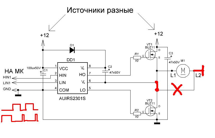 Изначально был и есть мост, с этого и продолжим. Методы управления мостом применительно к ДПТ два: так называемые симметричный и асимметричный. Симметричный, это когда попеременно включаются диагонали (в пределах одного периода ШИМ). Асимметричный - когда на одном пулумосте открыт один из ключей, а на другом - в пределах периода ШИМ включаются попеременно верхний и нижний ключи. Для проверки работоспособности полумоста (чем занялся автор) симметричный способ использовать сложно из-за особенностей работы бутстрепной схемы и вообще нужен второй полумост. Для проверки моста в асимметричном режиме требуется указанная схема включения. Двигатель подключаем на землю, чтобы не открывая нижний ключ зарядить С2. Если подключить ДПТ к +12В, то перед началом работы придётся открывать нижний ключ, чтобы зарядить С2.