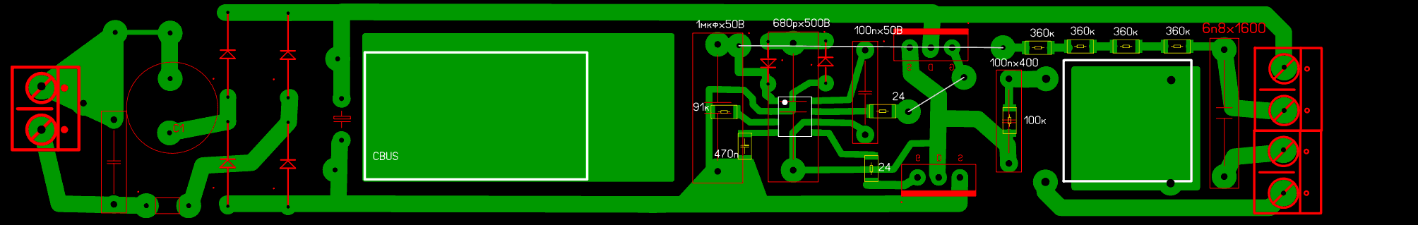 Километровые дороги от кондера к транзисторам - это плохо. А от установки С2 (по вашей схеме - пленка на ногах электролита) я вообще в шоке - зачем, спрашивается, стоит? У Вас токи проходят вообще мимо электролита CBUS и пленки! 2 нога микрухи ловит мусор с дорожки "минус кондера - исток VT2" (нижний по рисунку платы)... Короче, С2 должен стоять четко возле истока VT2 и стока VT1, электролит - тоже как можно ближе к ним и к С2, 2-ю ногу - на исток звездой. Желательно электролит отразить по горизонтали. С8 (680р*500В)- тоже убрать с ноги микры и на точку соединения транзисторов звездой ( а еще лучше 6 ногу на исток верхнего транзистора звездой).