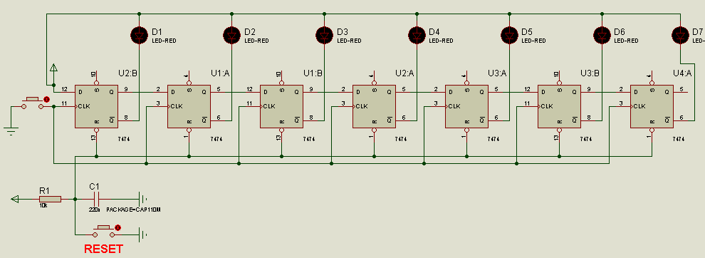 Rokl Ну я же не виноват, что тот набросок, сделанный в протеусе за пару минут, топикстартер примет как руководство к действию Я принцип показать хотел. Что можно использовать любой сдвиговый регистр из последовательного кода в параллельный, когда на вход данных все время подается "1", а на C идут импульсы с кнопки. Я бы сам по такой схеме делать не стал. Хотя учитывая опыт и квалификацию топикстартера, может эта схема ему и будет "в самый раз".