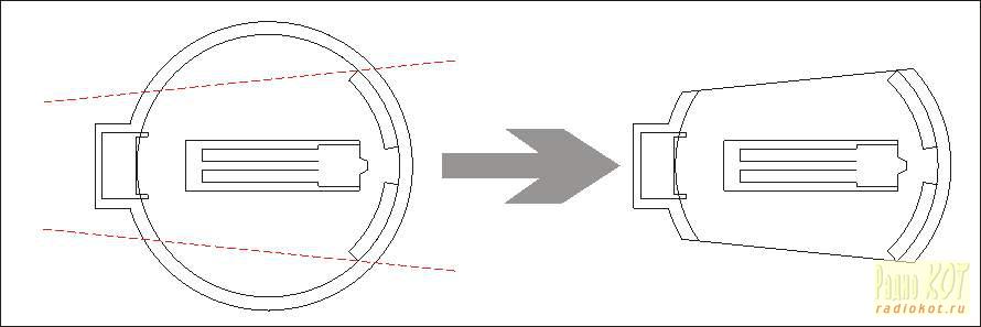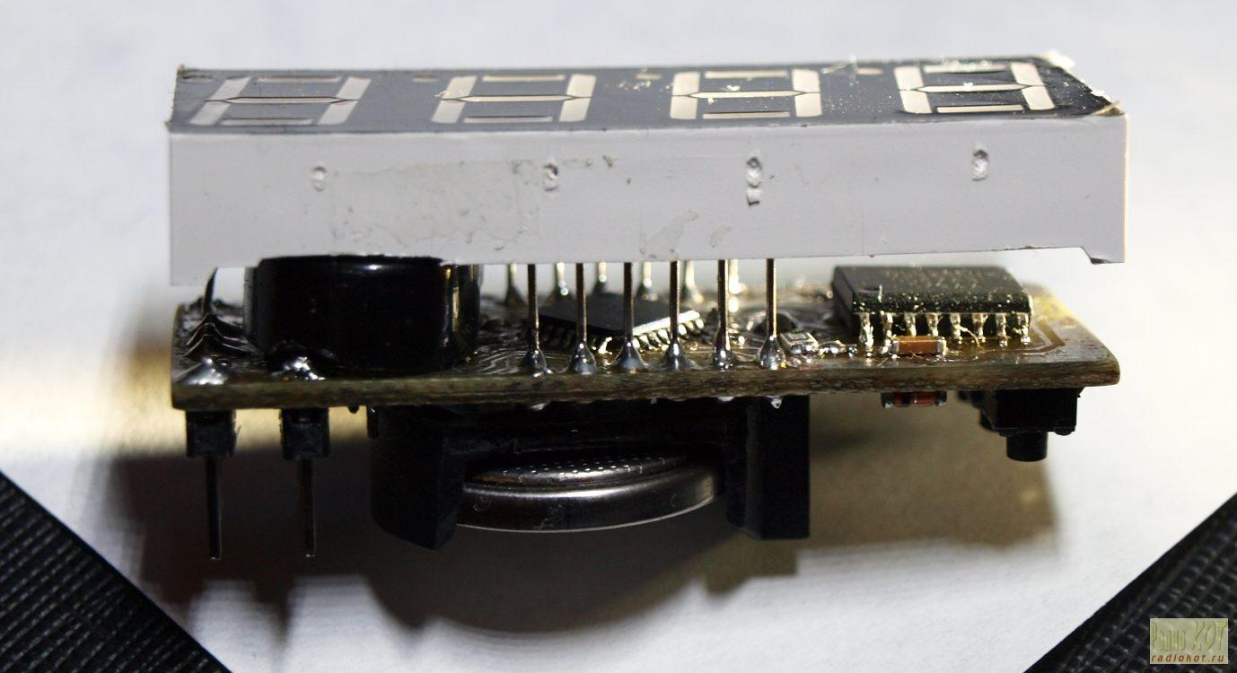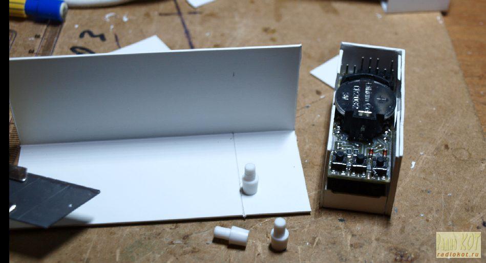 Обрезка держателя батарейки Общий вид собранной платы Корпус Корпус часов - самодельный, изготовлен из пластикового уголкового профиля (используется, например, для закрывания угла при поклейке обоев и т.д.) Профиль приклеивается непосредственно к дисплею, дальше уже на него наклеиваются другие элементы корпуса. В частности, для толкателей кнопок нужно обеспечить ограничение их перемещения только в продольном направлении - для этого делаются специальные отсеки. Сами толкатели изготовлены из фишек от игры "Морской бой". Учитывая то, что ширина дисплея 19.5 мм, а диаметр батарейки - 20 мм, верхняя и нижняя стенки делаются из двух слоев пластика, во внутренних слоях выполнены прорези под батарейку. Предварительная оклейка тонировочной пленкой для стёкол автомобиля, далее верхняя, нижняя и боковые стенки будут оклеены непрозрачной декоративной пленкой. Работа часов, управление В основном режиме часы отображают текущее время на протяжении 8 секунд, далее 3 секунды число и номер месяца, потом 3 секунды номер дня недели. Вначале высвечивается номер будильника "AL.#", (# - номер будильника от 1 до 4 ) краткое нажатие "Select" отображает время срабатывания будильника или "OFF", если будильник выключен. Если будильник включен, то краткое нажатие на "Select" приводит к отображению режима будильника - "ONCE" (если будильник разовый) или "E.dAY" - если будильник ежедневный. Если будильник выключен - цикл отображения времени и режима пропускается. Следующее нажатие переключает часы в режим отображения следующего будильника или, после отображения данных по будильнику №4 - в основной режим. Установка будильника. Кратким нажатием на кнопку "Select" необходимо перейти в режим отображения информации по нужному будильнику. После этого необходимо зажать кнопку "Select" до начала мигания часа срабатывания будильника. Кнопками "+" и "-" нужно выставить желаемый час срабатывания будильника, кратким нажатием "Select" перейти к установке минут срабатывания будильника. Дальнейшее краткое нажатие "Select" приведет к выбору режима будильника (режим так же выбирается кнопками "+" и "-"): "OFF" - будильник выключен, "ONCE" - once - однократный будильник, "E.dAY" - every day - будильник срабатывает каждый день. Если выбран режим "OFF" - нажатие на "Select" приведет к выходу в основной режим отображения времени. Иначе нажатие на "Select" приведет в режим выбора мелодии будильника: "Snd.#" - # - это номер мелодии. Кнопками "+" и "-" можно выбрать желаемую мелодию. При этом выбранная мелодия сразу начинает воспроизводиться. Нажатие на "Select" приведет в режим выбора громкости : "ton.#" # - уровень громкости от 1 до 7. Краткое нажатие "Select" приведет к сохранению настроек будильника и выходу в основной режим отображения. Если в режиме настройки будильника не выполнять никаких действий на любом этапе настройки будильника - через 8 секунд настройки будильника сохранятся и часы перейдут в основной режим отображения. При входе в режим настроек будильника, который находится в выключенном состоянии, режим будильника автоматически переключится в однократный. Установка даты/времени/дня недели. Для установки необходимого параметра необходимо нажать и удерживать кнопку "Select" в тот момент, когда этот параметр отображается на дисплее. Для установки времени нужно зажать кнопку "Select" в момент отображения времени. При этом значение часов начнет мигать. Кнопками