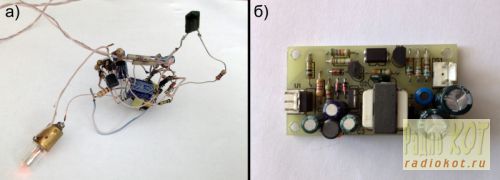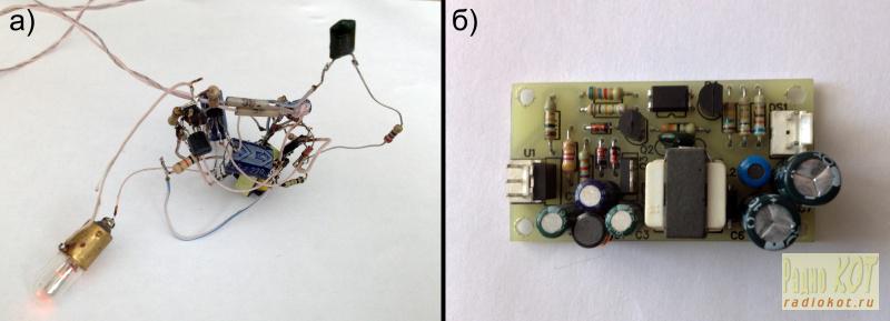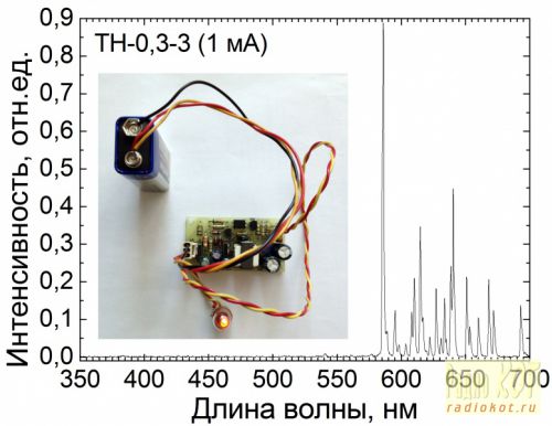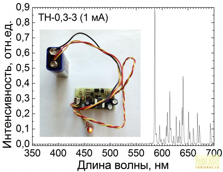 Автор: Evgenij Дорогой Кот! Поздравляю тебя с 12 Днем рождения! Желаю твоему сайту больше качественных публикаций и продвинутых радиолюбителей! В настоящее время известно достаточно большое число схем преобразователей низкого напряжения в высокое. Однако с точки зрения простой и доступной каждому радиолюбителю схемотехники свою нишу уверенно занимают схемы, построенные на основе блокинг-генератора. В данной публикации пойдет речь о стабилизированном по току блокинг-генераторе для питания неоновой лампы. Введение Известно, что одной из важных задач в спектроскопии видимого диапазона является калибровка спектрометров для получения точных и надежных результатов измерений. По этой причине появляется необходимость в калибровочных источниках света, к которым предъявляется ряд требований: 1) Источник света должен обладать стабильным линейчатым спектром с точно известным положением излучаемых (эмиссионных) линий; 2) Линии должны быть узкие и изолированные; 3) Желательно, чтобы линии равномерно располагались по всей ширине спектра; 4) Желательно, чтобы линии имели постоянную интенсивность (высоту) для упрощения процедуры обработки спектра. Как правило, подобным требованиям отвечают различные газоразрядные лампы низкого давления, излучение света в которых осуществляется в условиях тлеющего разряда. Для спектрометров, работающих в видимом диапазоне длин волн, наиболее доступным источником для калибровки является ртутные энергосберегающие лампы [1], которые помимо излучения люминофора содержат эмиссионные линии паров ртути (рисунок 1). Рисунок 1. Спектр излучения энергосберегающей флуоресцентной лампы. Спектр флуоресцентной лампы характеризуется наличием линий, равномерно распределенных по всему спектру. Имеются как одиночные пики (405, 436 нм), так наложенные (546, 612 нм). Однако данные лампы, несмотря на доступность и пригодность для калибровки, имеют ряд недостатков таких как: 1) Ощутимый нагрев лампы, как следствие изменение интенсивности линий, их уширение, и снижение надежности источника света; 2) Большая потребляемая мощность, не позволяющая питать лампу, вмонтированную в спектрометр, через слаботочные источники питания; 3) Большие габариты; 4) Хрупкость колбы; 5) Наличие паров ртути в лампе, что противоречит современному представлению об охране природы и принципам зеленой химии; 6) Необходимость прогрева лампы; 7) Относительно небольшой срок службы (несмотря на указанные 12000 ч, на практике они редко работают в течение указанного срока). Указанное выше привело к размышлению, какие альтернативные источники света могли бы быть использованы для калибровки длины волны. Так возникла идея применения неоновых индикаторных ламп. Неоновая лампа самой простой конструкции представляет собой герметичный стеклянный баллон, в котором размещены 2 электрода, а пространство заполнено инертным газом – неоном – при низком давлении. При приложении напряжения к электродам возникает ионизация атомов неона, и газ становится электропроводным. При контакте иона газа с отрицательно заряженным электродом (катодом) положительно заряженный ион газа принимает электрон, переходя в нейтрально заряженный атом с избыточной энергией, которая высвобождается при его переходе в основное состояние с излучением характеристических квантов света. По энерги