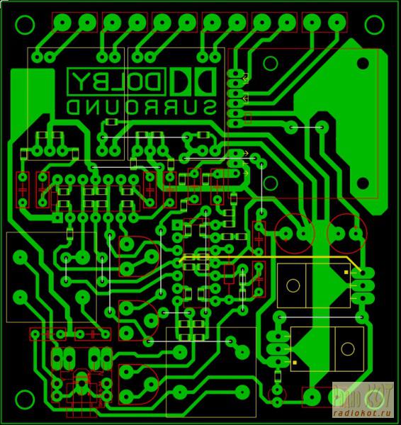 Автор: Дмитрий Веселов Однажды друг купил новый телевизор, всем хорош, и спутниковый рессивер в нём встроенный, и любые фильмы с флешки показывает, и музыку с неё-же воспроизводит. Вот только встроенный звук в нём оказался крайне отвратительного качества, а так как друг мой любитель минимализма, то захотел он избавится от полки под телевизором, а за одно и от спутникового рессивера, и от DVD плеера со встроенным усилителем 5+1 для "домашнего кинотеатра", которые на этой полке стояли, и кучи проводов всё это дело между собой сединявших, более не нужных. Тем более не умел усилитель встроенный в DVD раскодировать звук на все 6 колонок с внешнего входа, только на 2+1, что моего друга не устраивало. Так как единственным источником звука оставался телевизор, требовался усилитель минимальных габаритов, который таки умеет греметь всеми шестью колонками всегда, и не требует никаких дополнительных навыков от пользователя, за чем и обратились ко мне. Поскольку основным требованием было отсутствие дополнительных органов управления, решено было использовать выход для наушников. Звук на выходе оказался достаточно качественным для усиления, и полностью регулировался встроенными в телевизор средствами. В результате родилась следующая схема. Принять звук решил стандартными звуковыми трансформаторами на 600ом, далее он разделяется на 6 каналов следующим способом. Правый и левый каналы через буферные ОУ проходят на усилители передней стереопары. Ещё два ОУ усиливают разностный сигнал между правым и левым каналом, он подаётся на усилители задней стереопары. И после ещё двух буферных ОУ, правый и левый канал смешиваются при этом подавляется разностный сигнал, а фазные составляющие подаются на усилитель центрального канала, фильтр ВЧ и усилитель канала низкочастотного, всего задействовано 8 ОУ, два корпуса счетверённых ОУ TL074, в качестве усилителей мощности решено было использовать модули D-класса на 3 ватта, которых после предварительных испытаний показалось вполне достаточно для необходимой громкости, для сабвуфера применил модуль на 10ватт, через него-же усиливается и центральный канал. Остальные детали те что оказались под рукой на тот момент.