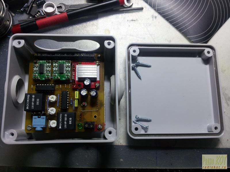 Вся конструкция влезла на плату 80х85мм и в стандартную распаечную коробку100х100 в качестве корпуса, провода от колонок и блока питания привинчиваются на винтовые клеммы, расположение стабилизаторов напряжения на плате обусловлено имевшимся в наличии радиатором, в моём случае он плоский и располагается под платой, поэтому стабилизаторы припаяны со стороны проводников, поскольку плата рисовалась прямо "из головы" без всякой схемы, на ней предусмотрено много места под дополнительные детали, на всякий случай для подгонки "по месту", будем считать её версией 1.0) Схему-же рисовал уже потом по памяти и посматривая на рисунок платы, поэтому могут быть незначительные расхождения за которые прошу тапком не кидать) Так начинался монтаж платы: Примерка к корпусу: