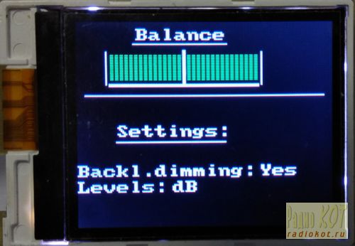 На одной стороне платы находится схема контроллера, на другой стороне - сам дисплей. Размер дисплея - 128*160 пикселей, что позволило разместить почти всю необходимую информацию на основном экране в виде так называемых Баров, то есть ползунков. В нижней части экрана горизонтально расположен бар регулировки общей громкости, в верхней части - вертикальные бары регулировки тембров и уровень канала сабвуфера. Уровень громкости так же показывается числом от 0 до 79, где 0 - звук отсутствует, 79 - максимальная громкость. Уровни затухания тембров могут показываться в децибелах от -14 до +14 dB (как на скриншоте) или так же, как громкость - в числах от 0 до 14. Режим отображения моржно изменить в настройках, об этом далее. Уровень сабвуфера так же может отображаться в децибелах от -15 до 0 или в цифрах от 0 до 15. В исходном состоянии регулируется громкость. Переход на следующее поле происходит путем нажатия кнопки энкодера по следующей схеме: Громкость-ВЧ-СЧ-НЧ-Сабвуфер - Баланс - Настройки - Громкость. Изменение выбранного поля производится поворотом энкодера. Из любого положения через несколько секунд происходит автоматический выход в режим регулировки громкости с записью изменений в энергонезависимую память микроконтроллера. В режиме настроек можно изменять два парамета: Backl.dimmig - затухание подсветки дисплея при неактивности. Yes - Дисплей гасит подсветку на половину, в активном режиме подсветка включается на максимум; No - подсветка всегда на максимуме. Levels - выбор показа уровней тембров и сабвуфера в относительных числах или в dB. Немного о работе устройства. При включении питания происходят начальные установки PT2322, считывание из энергонезависимой памяти всех уровней и настроек, прорисовка баров, включение подсветки дисплея, и плавное поднятие громкости от 0 до считанного значения. Чтобы по ушам не било. :) Далее устройство готово к работе. Через несколько секунд неактивности подсветка гаснет примерно наполовину, и возвращается на максимум при любой регулировке. При первой прошивке настройки тембров и сабвуфера устанавливаются в средние положения, громкость на 10. Устройство, на мой взгляд, получилось не перегруженное функционалом, с довольно наглядной и удобной индикацией. Управлятор должен управлять ! :) Показывать время и варить кофе он не умеет. :))) Из рекомендаций по подключению устройства к усилителю: предварительные усилители и НЧ-фильтр для сабвуфера должны находиться после PT2322, тогда сигнал на усилитель будет приходить оптимальным. О программной части. Программа писалась в среде программирования Bascom AVR 2.0.7.3. Микроконтроллер тактируется от встроенной RC-цепочки на 8 МГц, монитор питания отключен. Так же рекомендую включить фуз "Preserve EEPROM when chip erase" для того, чтобы записанные ранее в EEPROM все настройки не стирались при следующих возможных перепрограммировании чипа. Все необходимое для проекта есть в приложенных архивах: программа и исходники, платы в формате Lay6, а так же библиотека дисплея. Во время написания программы старался по максимуму комментировать код для удобства понимания и возможной адаптации под чьи-то нужды.