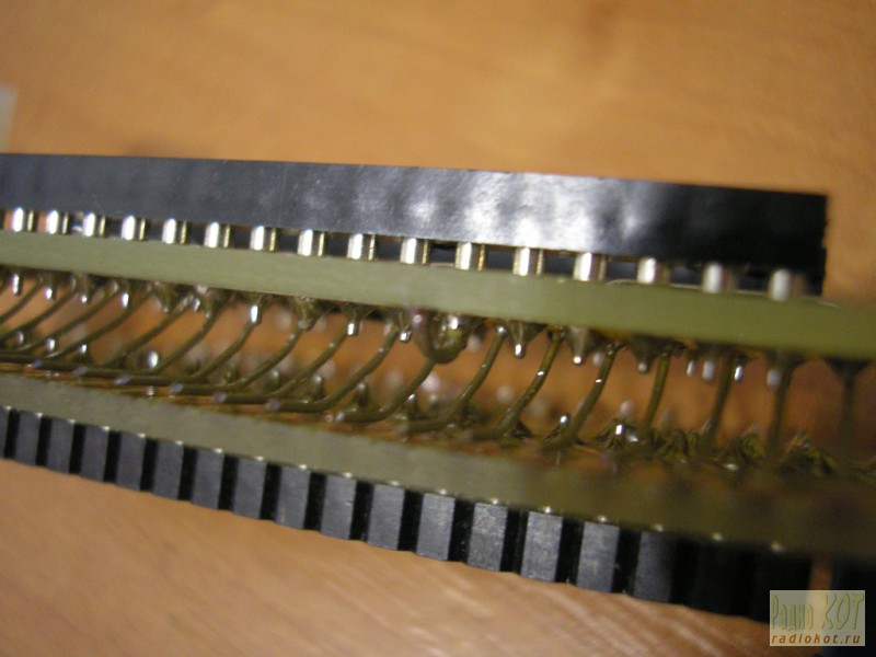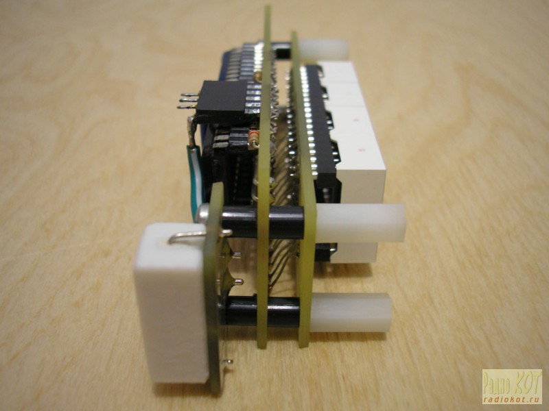 После этого складываем платы пайкой друг к другу, скрепляем на болтики с втулками. Лишние по длине перемычки аккуратно обрезаем маленькими бокорезами. После чего нужно пинцетом прижать каждую обрезанную перемычку к плате для дальнейшей припайки.