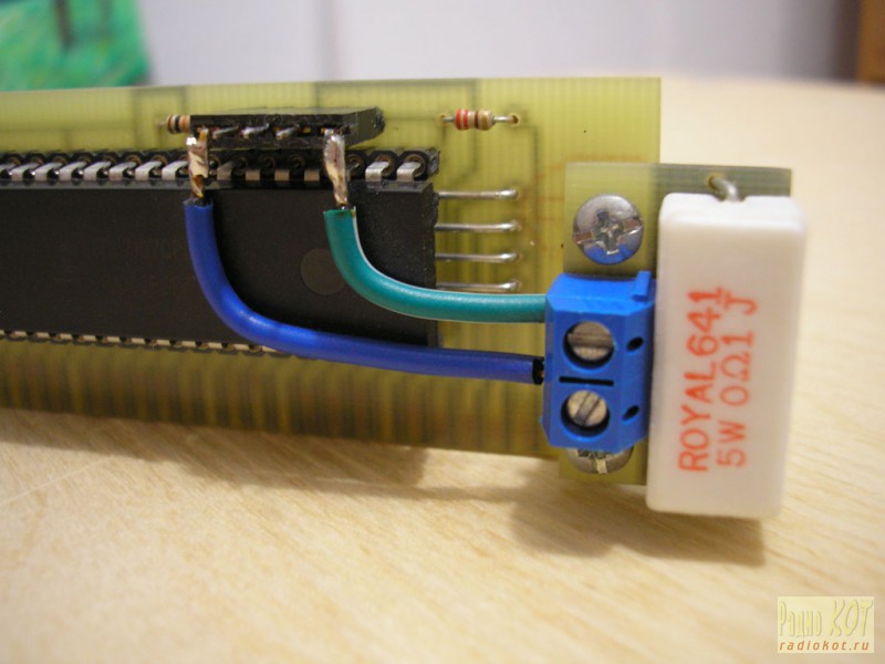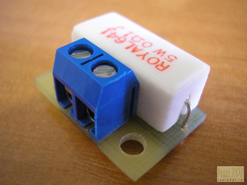 Передохнули, поехали дальше – амперметр. Конструктивно амперметр собирается также как и вольтметр, за исключением небольших изменений в входной части схемы(10к резистор впаивается вместо 1М), переносом перемычки запятой и добавлением платы с шунтом на 5А в виде цементного пятиватного сопротивления величиной 0,1R. Цвет свечения индикаторов амперметра я выбрал красный (вольтметра зелёный). Плата шунта монтируется к плате измерения через втулки при помощи длинных болтиков М3. В оригинале статьи, на схеме, были ещё два предела измерения 2А и 10А, но при попытке установить шунт на 2А (5Wt/1R) значение тока на индикаторе не соответствовали действительному, да мне и 5А, одного предела достаточно. Если у кого получится, напишите что делали для настройки или какое сопротивление ставили. Перемычка на свечение запятой ставится в HL6 (в вольтметре на HL3). Амперметр готов. Питание. Осуществляется параллельно от стабилизированного двуполярного источника питания 5В (7805, 7905), конструктивно выполненного на отдельной плате. В оригинале схемы питание выполнено на микросхеме 7660 (8pin/DIP), отрицательный стабилизатор напряжения -5В. Настройка. Настройка сводится к калибровке показаний напряжения (тока) равного показаниям образцового (поверенного) прибора, при помощи вращения движка построечного сопротивления в большую или меньшую сторону показаний. Учитывая что в схеме установлен многооборотное сопротивление , калибровка показаний очень легка. Детали. Все резисторы 0,125Вт конденсаторы керамика на 50В, подстроечное сопротивление многооборотное (попадалось меньше по размерам , но цена в 3 раза дороже – 1$). Вместо панельки под микросхему и индикаторы использовал 40 pin цанговую линейку (резал пополам), можно применить и панельку, тогда необходимо внутри вырезать перемычки (цена линейки около 1$), диоды 1N4148, 1N4007. Индикаторы 7-и сегментные, 13мм, зелёного и красного свечения с общим анодом.