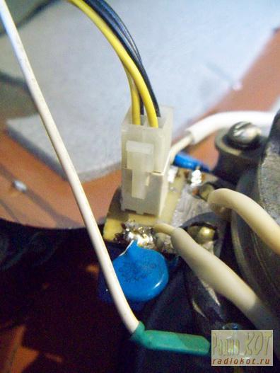 Шум я устранял привычными кошачьими методами: установкой мягких подушечек на лапы амортизаторов между узлами, чисткой и смазкой подшипников, прижима всех болтающихся и дребезжащих частей на эластичные уплотнения. Вот так выглядели "амортизаторы" подвеса агрегата. Толку от оных, естественно, было аки с козла молока. Вместо них были установлены шайбы из микропористой резины, как изнутри, так и снаружи кожуха. Думается, если заменить уплотнение агрегата (вон та здоровенная чёрная шайба на внутреннем торце кожуха) на более мягкое, гул можно снизить ещё на пару-тройку децибел. Но я решил заморочиться этим уже при замене агрегата, когда старому настанет окончательный кирдык. Попутно я наворотил прокладки из пенистого звукоизоляционного материала (пёс его знает, как он называется, но продаётся в строительных магазинах) на двусторонний скотч в местах привинчивания фланца агрегата к кожуху. Под винты, разумеется, также были подложены шайбы из микропоры. Отверстия были достаточного диаметра, рассверливать не пришлось. Следующим номером я подглушил сам кожух. Для этого к нему изнутри на тот же двусторнний скотч была прилеплена широкая полоса из того же материала: Дырка - в месте крепления выходного фланца. Из-за не совсем цилиндрической формы кожуха пришлось полосу надрезать в нескольких местах. Крышка по периметру была подглушена шайбой из этого же материала, а изнутри кожуха - днищем из него же. Здесь скотч не понадобился, ибо днище прижимается шурупами с широкими шайбами. Следом я перебрал сам агрегат. Старая смазка вместе с пылью была вымыта из подшипников бензином, затем их промыли средством WD-40 и разработали, после чего внутрь была набита свежая смазка (я использовал ЛИТОЛ-24, как наиболее высокотемпературную из имеющихся; солидол после пары десятков минут работы может просто весь вытечь). Ламели коллектора были тщательно вымыты изопропиловым спиртом и отшкурены до зеркала "нулёвкой" (зернистость Р2000), после чего ещё раз промыты на предмет удаления мелкой стружки из зазоров между ними. Для пущей герметичности под верхний подшипник был подложен кусочек резины. Вот "родной" агрегат в сборе. Справа болтается советский фильтр. Толку от него немного: он полностью емкостной, вдобавок соединён с обмотками достаточно длинными проводами, кои очень лихо излучают помехи на непредсказуемых частотах, определяемых их длиной. По входу я применил готовый индуктивно-емкостной фильтр на 4 А от какого-то польского аппарата. Ведь, кроме коллекторного двигателя, планировалось установить симисторный регулятор, который сам по себе является неслабым источником помех. Помехоподавляющие ёмкости на коллекторе я поставил прямо на торцы щёток. Таким образом, они оказались включенными не ДО обмоток статора, а ПОСЛЕ оных. Для ВЧ помех эти обмотки служат дросселем, благополучно не пропускающим эти самые помехи к фильтру. Однако до статора я включил ещё один конденсатор. Конденсаторы в эту цепь надо выбирать плёночные и на рабочее напряжение не ниже 275 В ПЕРЕМЕННОГО (!) тока, или 630 постоянного. Коллектор движка - место, где имеется частая коммутация, т.е. переходный процесс, а при индуктивном характере нагрузки он сопровождается значительными, хоть и кратковременными, пиками напряжения. Поэтому любителям схалтурить бабах гарантирован. Для повышения ремонто