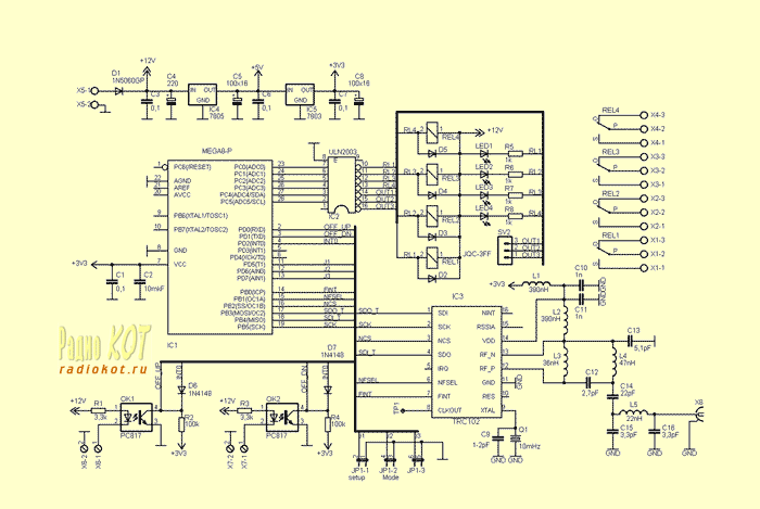 В его составе МК ATmega8L (IC1), микросборка 7-ми канальный "усилитель-ключ" ULN2003 (IC2), микросхема приёмопередатчика TRC102 (IC3), двухступенчатый стабилизатор на 5в. и 3,3в. (IC4, IC5). Применение двухступенчатого стабилизатора продиктовано исходя из соображения надёжности - у стабилизатора на 3,3 в. максимальное входное напряжение-15в., т.е. практически равно питающему напряжению устройства (12 в.). Да и стабилизатор на 3,3в. в "массивном" корпусе (для облечения теплового режима) найти довольно проблематично. Была идея сделать импульсный стабилизатор на МС34063, но остановился на варианте двух стабилизаторов, как на более простом.
