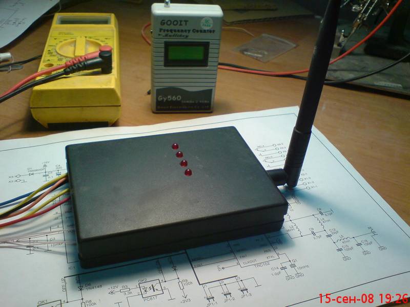 Настройка при правильно собранной схеме и из исправных элементов заключается только в установке несущей частоты передатчика и частоты приема. Если нет частотомера то настройку производят ("кастрюльным" способом, например) по максимальному расстоянию между приёмником и передатчиком в обычном режиме работы устройства, т.е. когда команды от брелока принимаются приёмным устройством. Настройку при этом можно провести только подстройкой частоты брелока конденсатором С4. Частота конечно не будет точно совпадать со значением 433920 кГц... Неприятность эту мы переживём:). Если же есть частотомер, то есть смысл точнее установить частоты. Для этого предусмотрен режим настройки. В брелоке он включается следующим образом. При снятом источнике питания нажимаем любую кнопку, и её удерживая подключаем источник питания. При этом трансивер TRC102 переходит в режим передачи немодулированной несущей. Подстройкой конденсатора С4 необходимо установить частоту передачи 433920 кГц. Контроль ведётся при помощи частотомера, подключенного непосредственно к антенному выходу или размещённого в непосредственной близости от антенны брелока (если позволяет конструкция и чувствительность частотомера). Если в режиме настройки частотомер показывает "что-то не то" (типа 355 МГц, например), то необходимо увеличить емкость С9 на 0,5-1 пФ. После настройки на 433920 КГц снимаем и ставим заново источник питания.