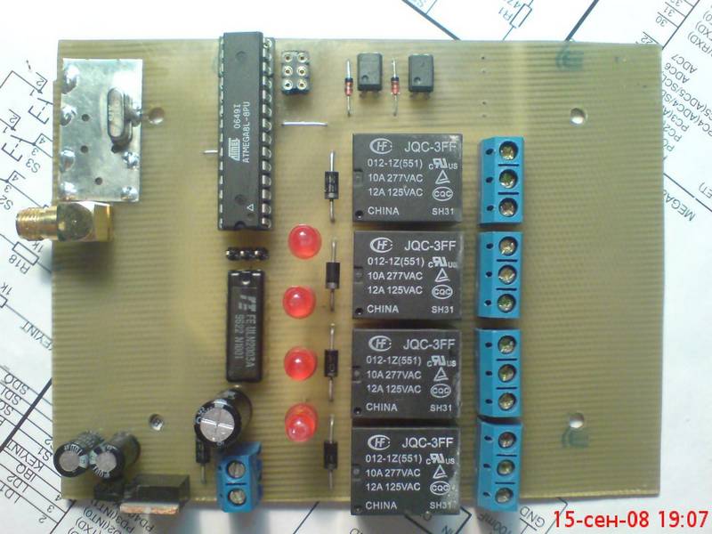Или подобрать вручную. При увеличении ёмкости на 0,5пФ частота понижается примерно на 7-8 кГц. После настройки приёмник необходимо обесточить и подключить питание заново. Настройка после этого завершена и можно произвести проверку работоспособности. Нажимая кнопки на брелоке контролируем срабатывание соответствующих реле.