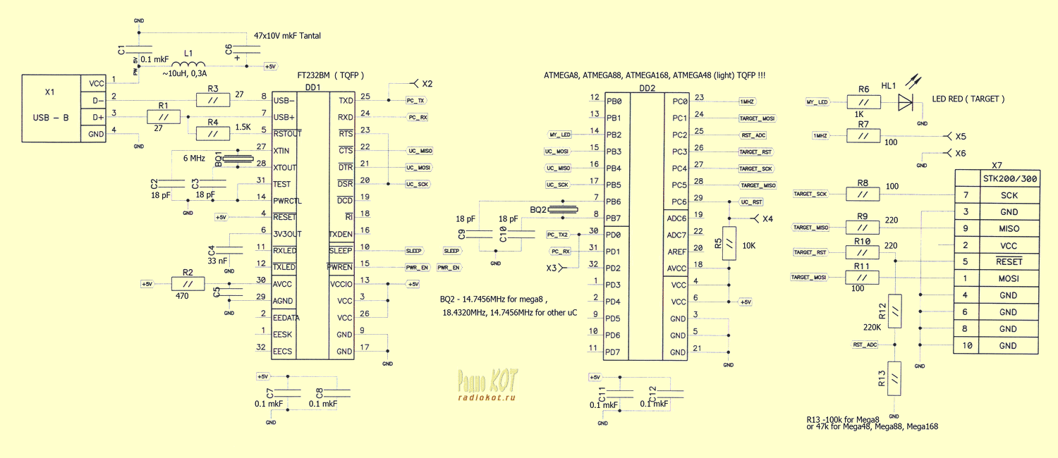 Программатор имеет стандартную разпиновку разьема для программирования как в фирменных программаторах STK200/STK500 от Atmel.